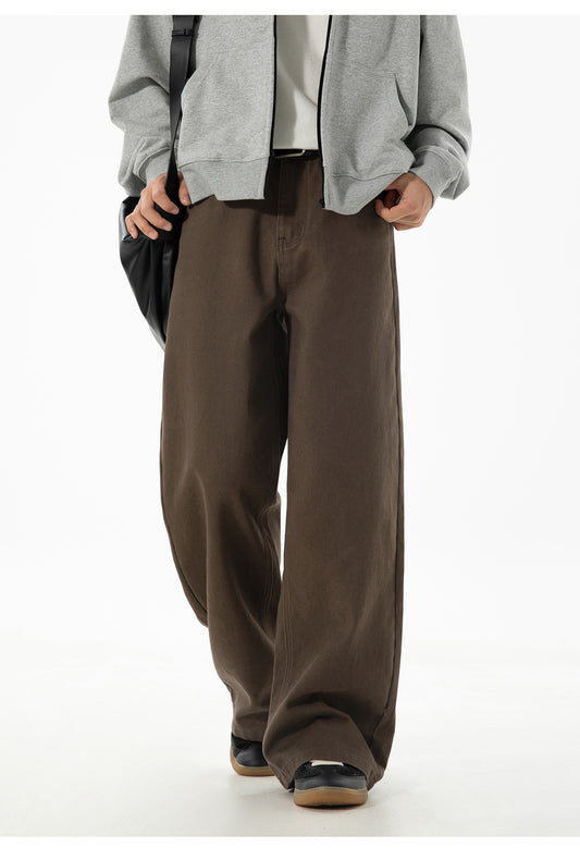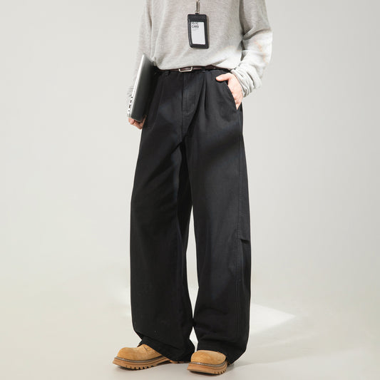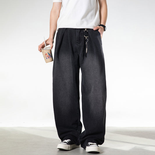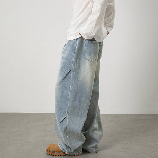 CBAON2624-8H 春秋側縫打褶水洗做舊直筒百搭寬鬆牛仔褲