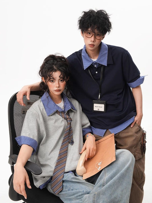 CBE8559-54B 假兩件格紋POLO夏季復古短袖T恤(2色)