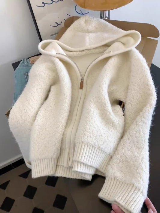 CGC522111-54B 白色羊羔絨連帽拉鍊開衫毛衣