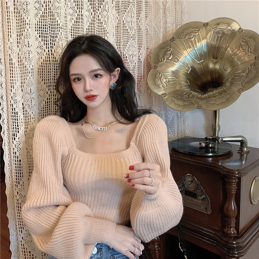 CGD3147-92B 復古氣質方領泡泡燈籠袖鎖骨坑條針織衫毛衣