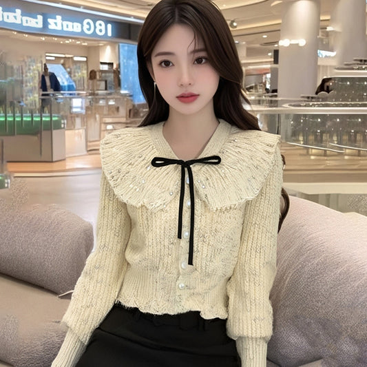 CGD05683-36H 娃娃領珍珠排扣蝴蝶結氣質收腰短款針織衫(3色)