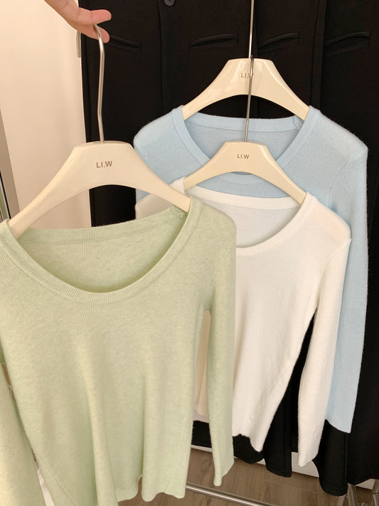 CGD6276-92B 百搭顯瘦大U領純色修身彈力長袖打底T恤