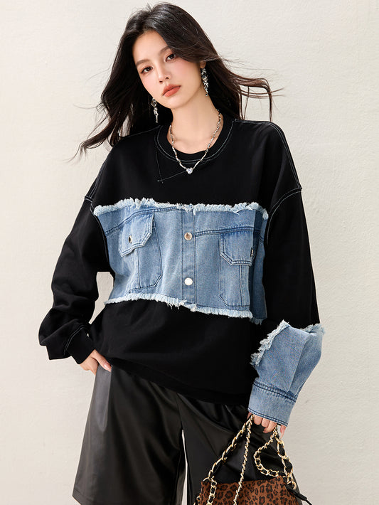 CGD5565-89B 牛仔拼接衛衣圓領長袖上衣