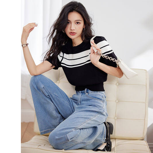 CGE8375-17B 條紋針織收腰泡泡袖T恤
