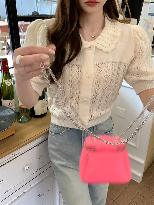 CGE6512-68B 單排扣短款泡泡袖鏤空針織上衣(2色)