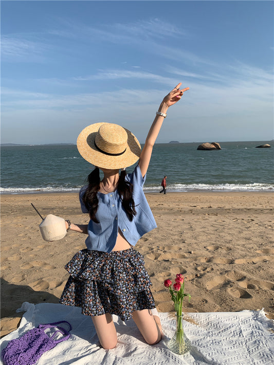 CGE5277-120B 百搭方領針織上衣+碎花小短裙套裝