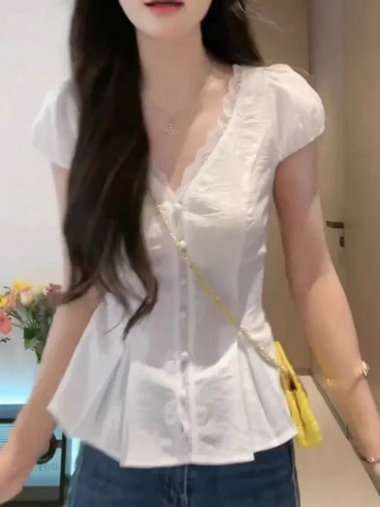 CGEA6623-4B 夏季圓領泡泡袖蕾絲襯衫