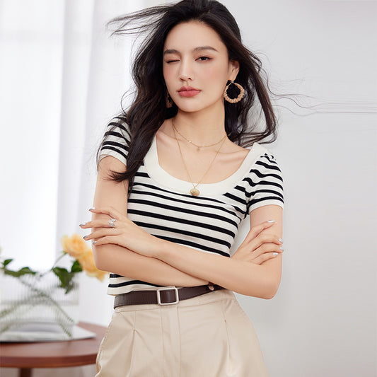 CGF8376-17B 冰絲條紋夏季薄款U領露鎖骨短袖針織T恤