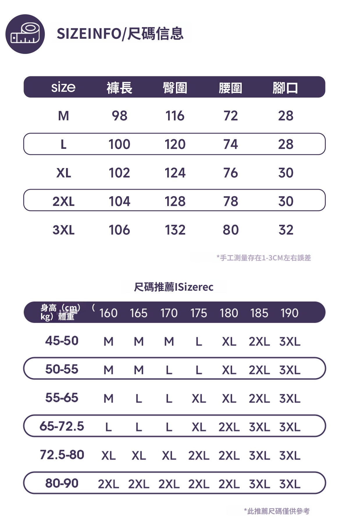 圍度量法:胸﹑腰﹑臀丈量方式為環繞一整圈量測,其餘為平量尺寸