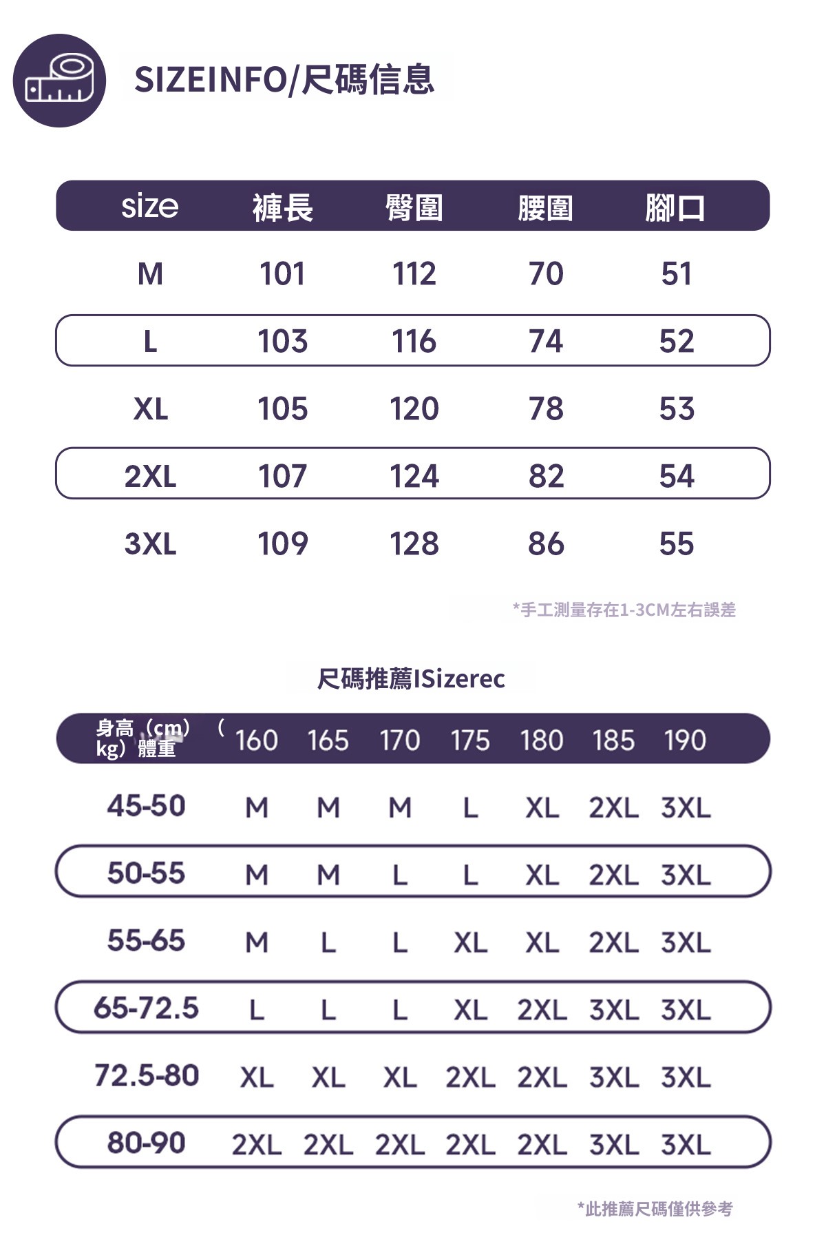 圍度量法:胸﹑腰﹑臀丈量方式為環繞一整圈量測,其餘為平量尺寸