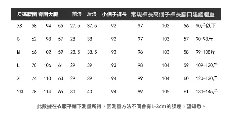 圍度量法:胸﹑腰﹑臀丈量方式為環繞一整圈量測,其餘為平量尺寸