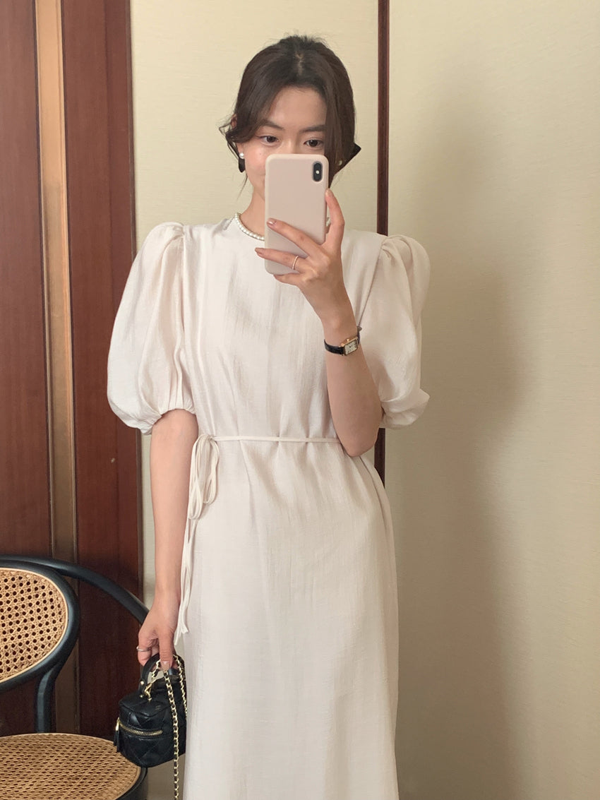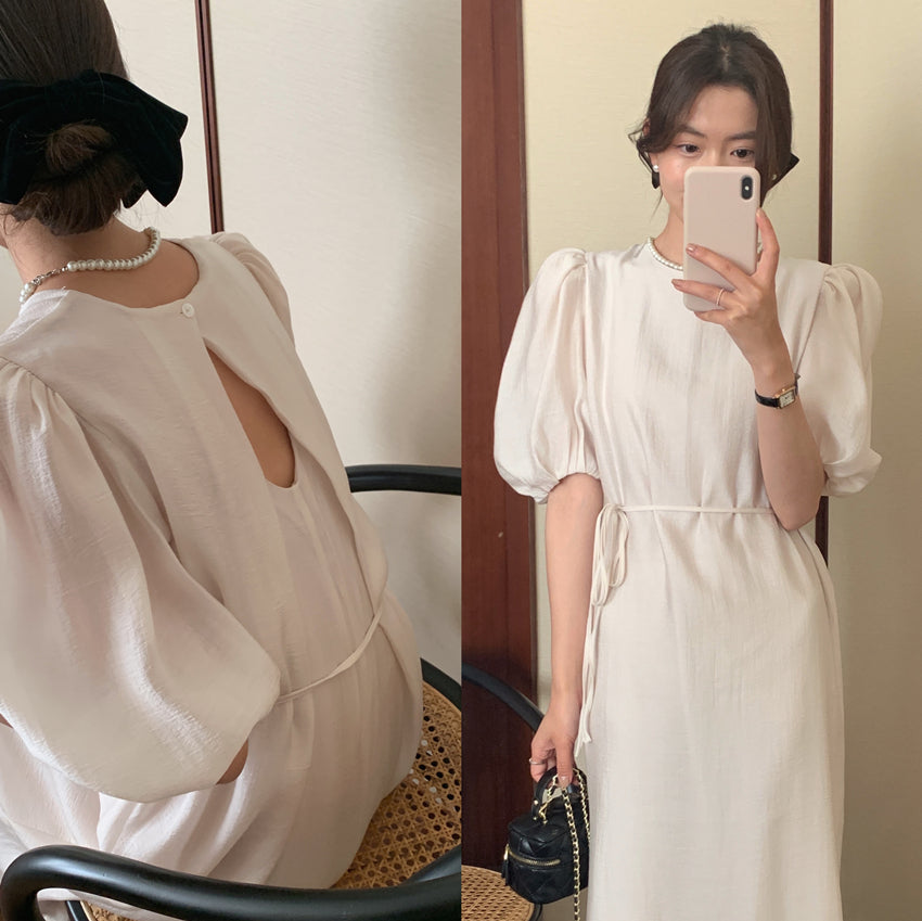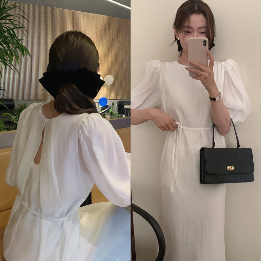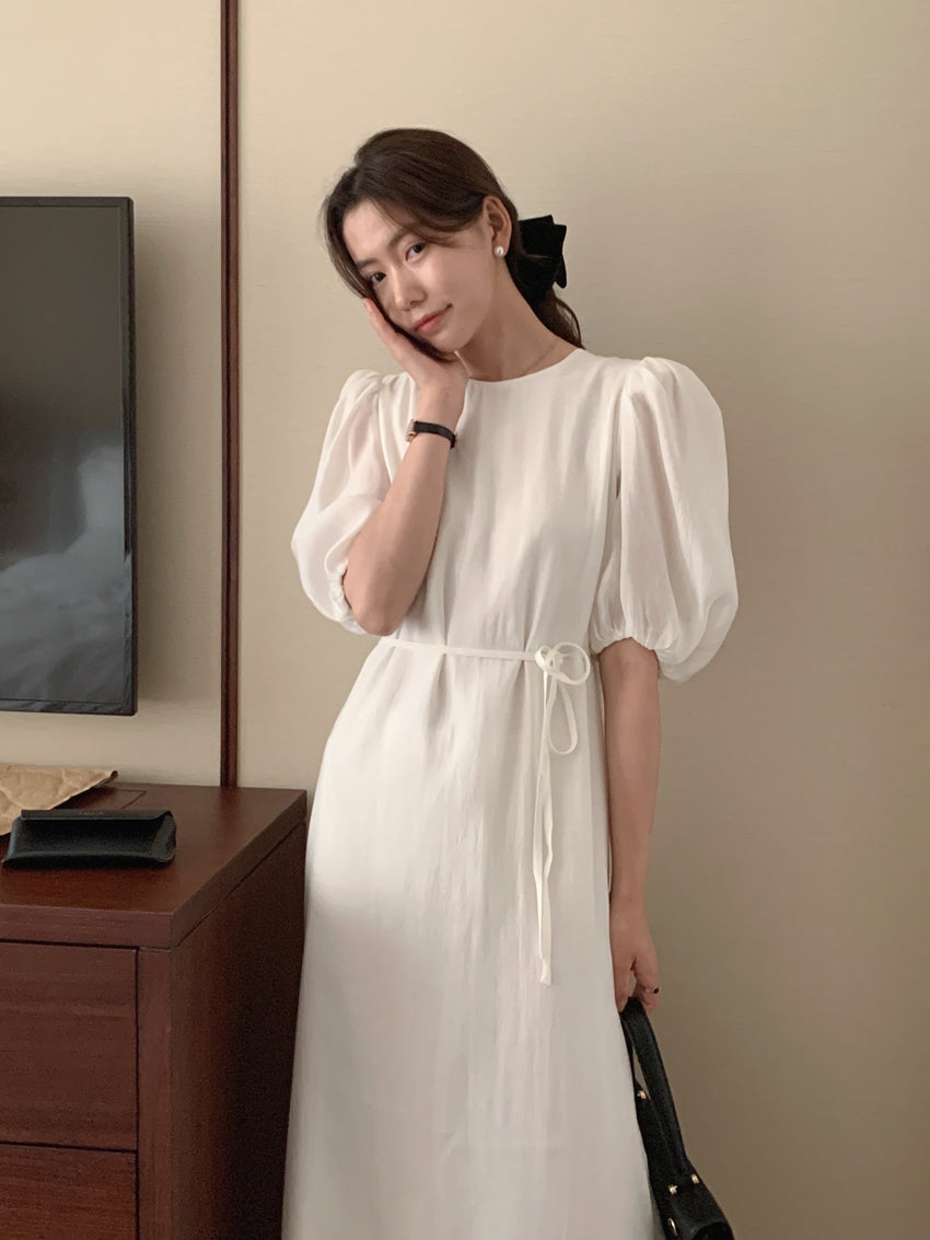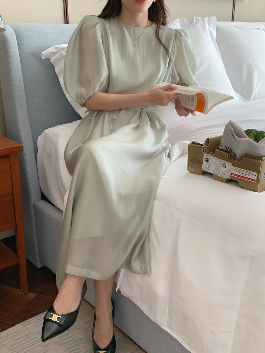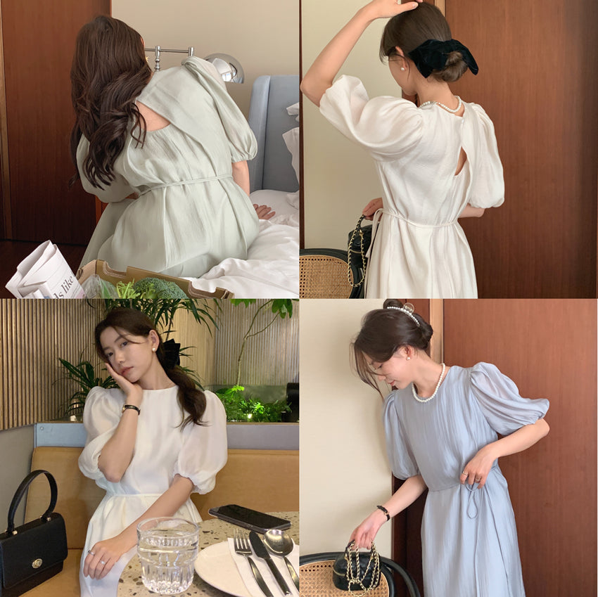 CGB1189-57B 復古泡泡袖鏤空設計系帶連衣裙(4色)