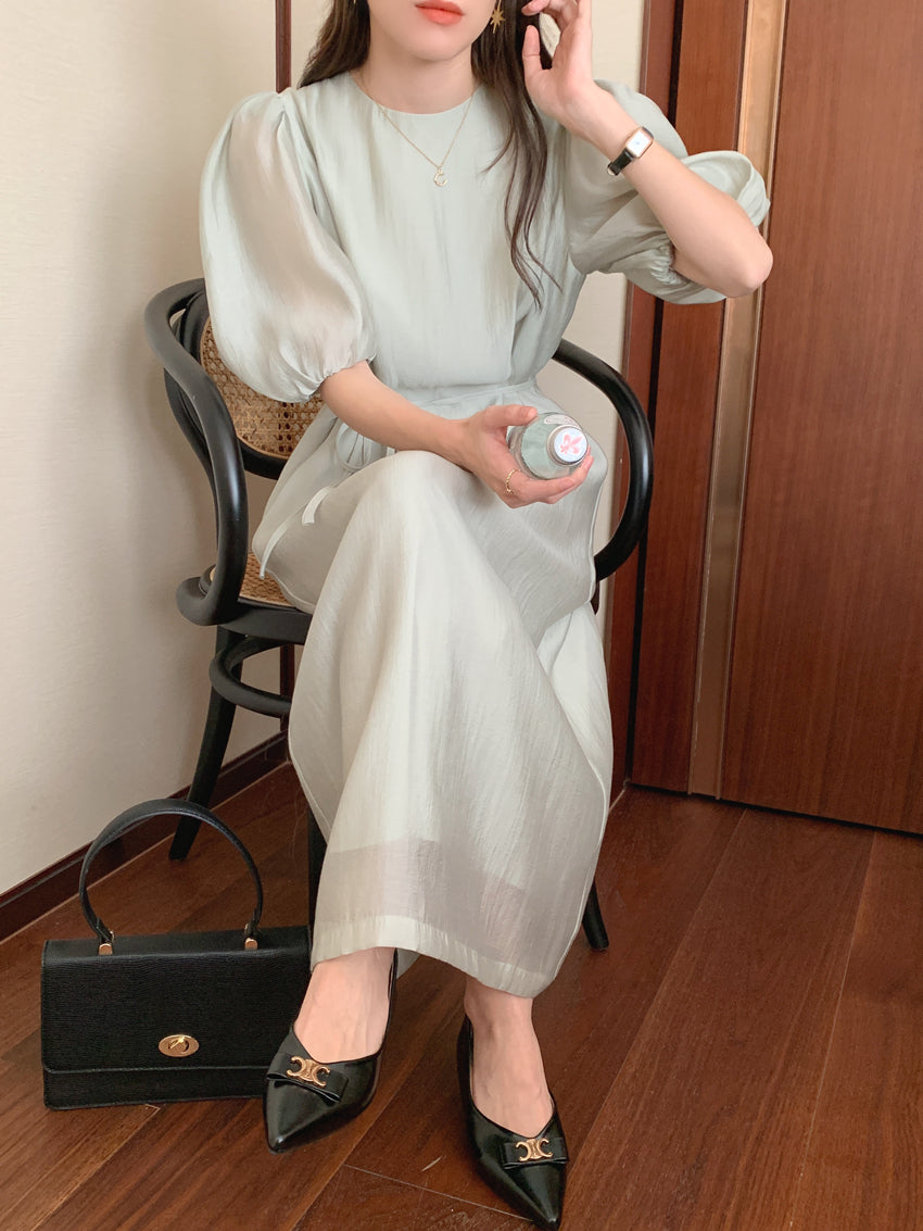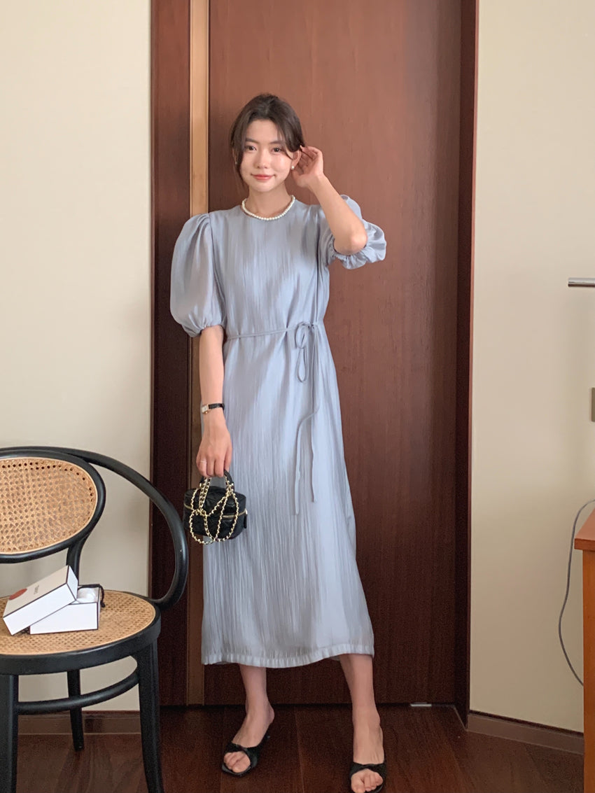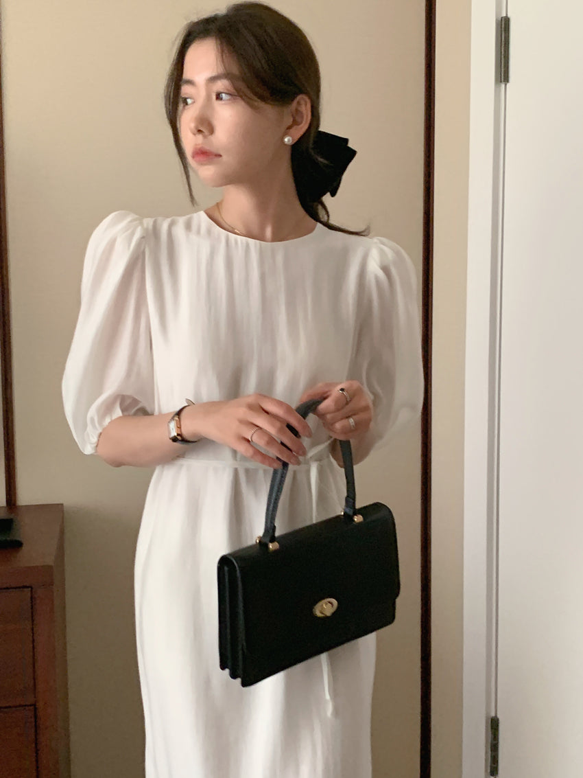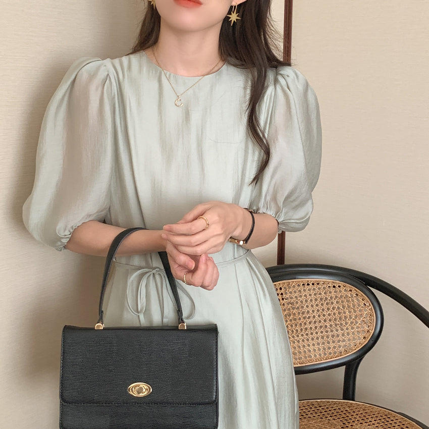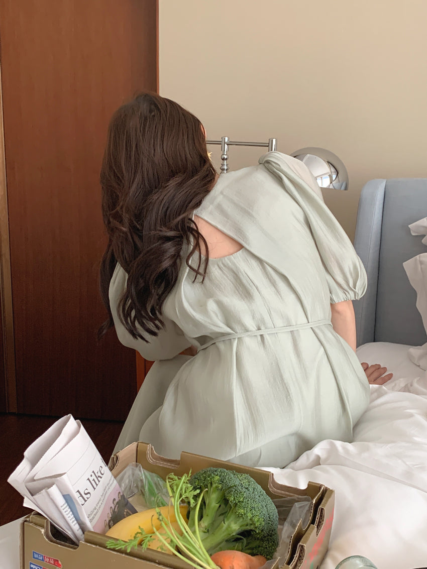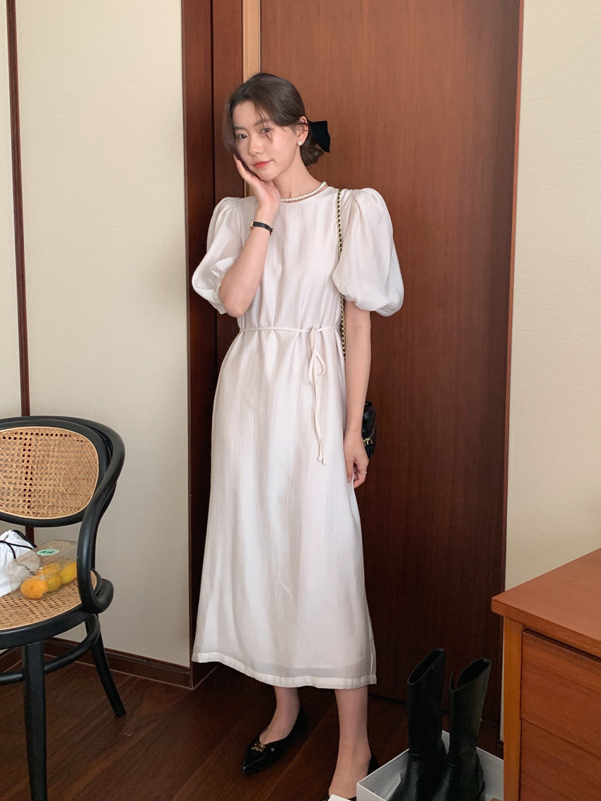 CGB1189-57B 復古泡泡袖鏤空設計系帶連衣裙(4色)