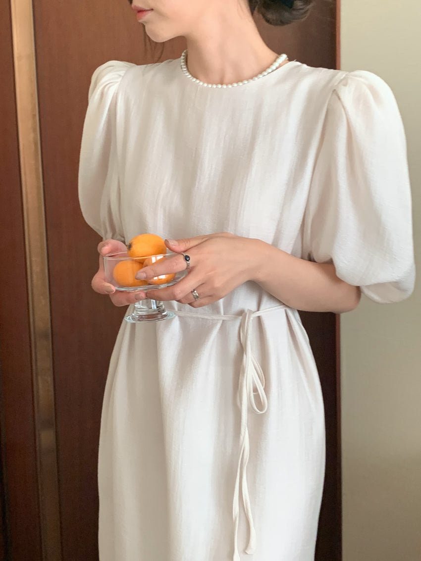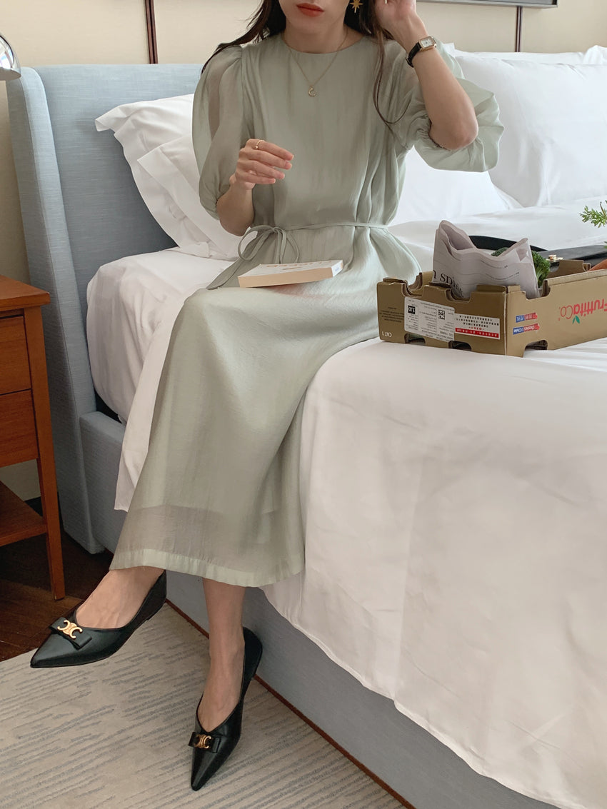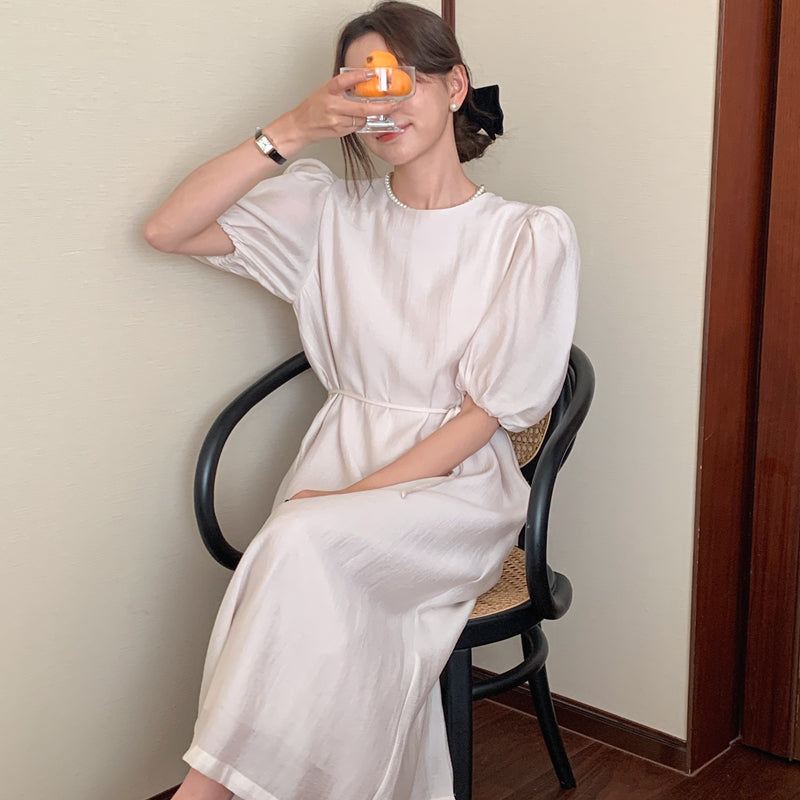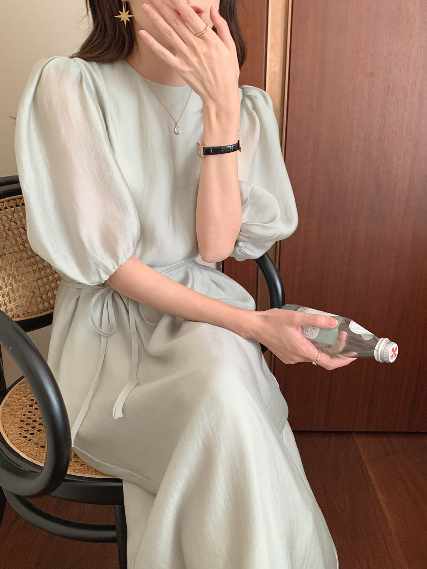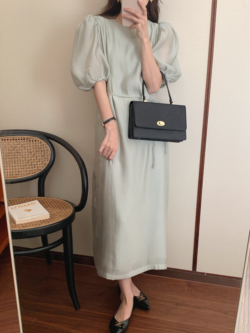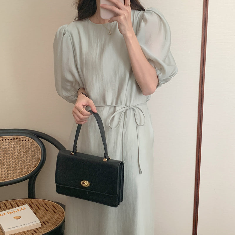 CGB1189-57B 復古泡泡袖鏤空設計系帶連衣裙(4色)
