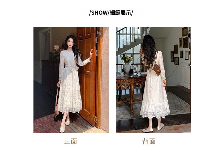📺︎︎ CGB7139-70B 春秋裝圓領長袖水溶花收腰顯瘦蕾絲連衣裙