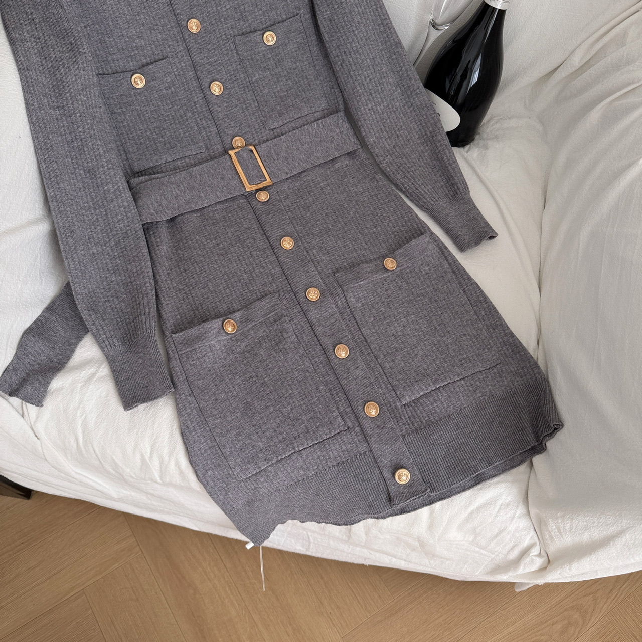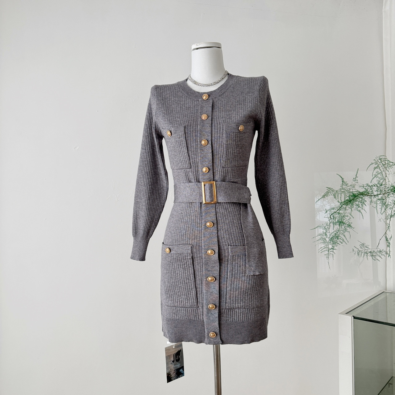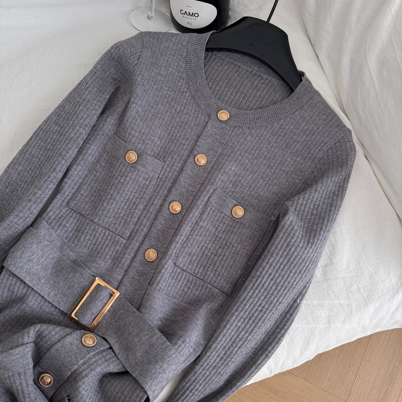📺︎︎ CGB9493-71B 金扣腰帶長袖圓領針織裙百搭修身毛衣連衣裙(2色)