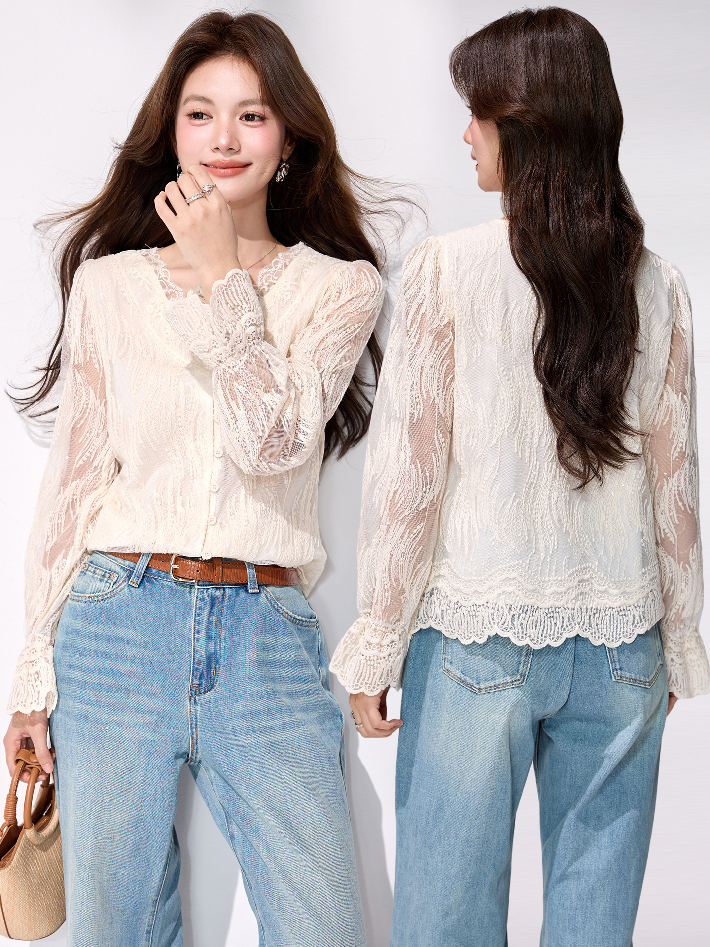 CGD12641-4B 春季蕾絲衫刺繡V領長袖襯衫
