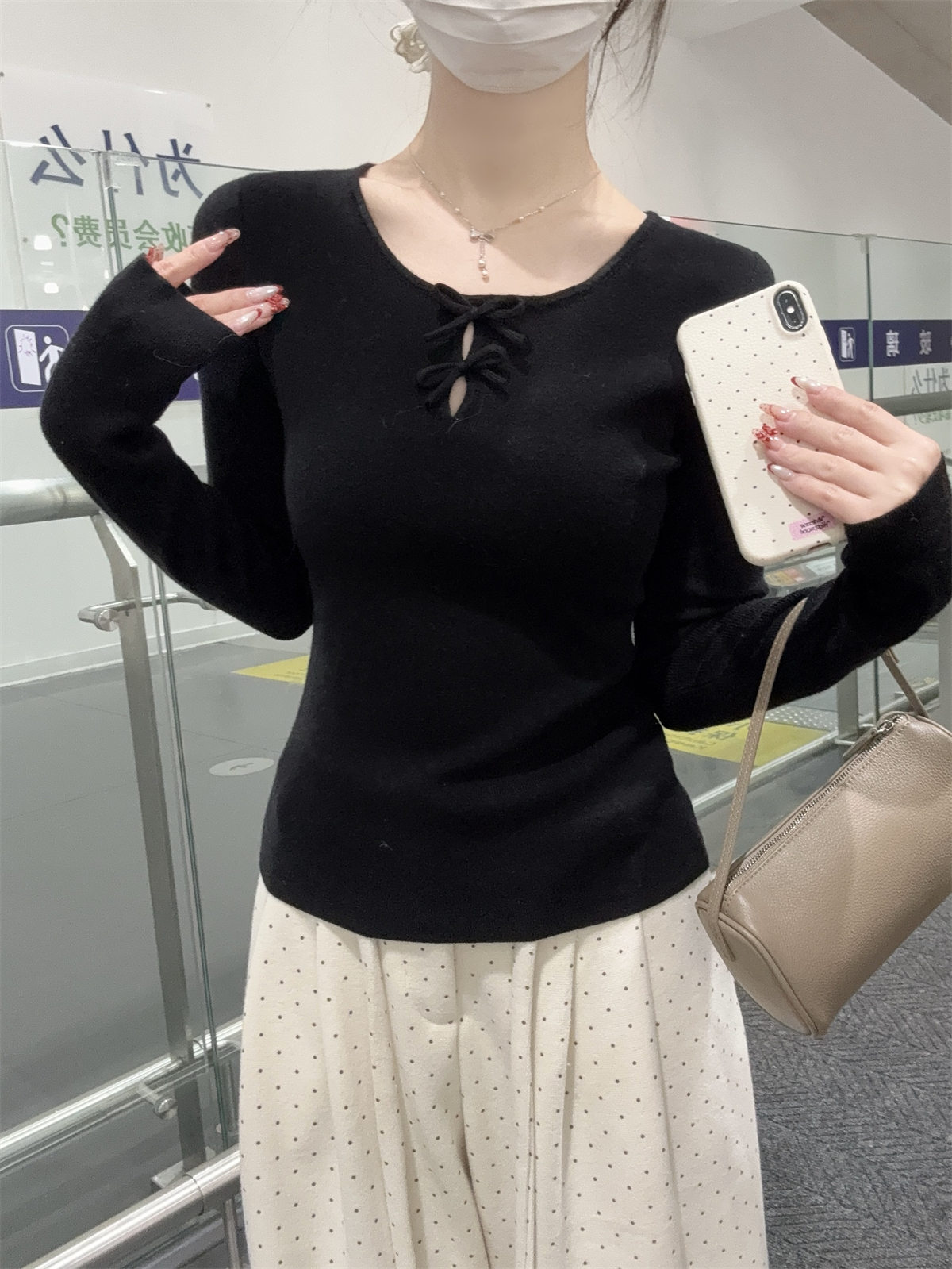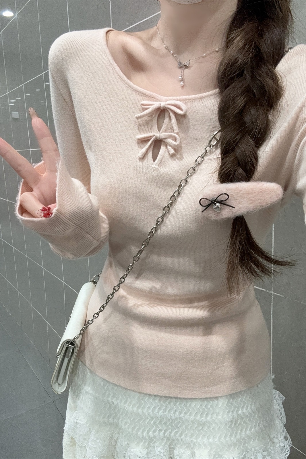 CGD28537-64B 春季圓領蝴蝶結鏤空設計安迪絨針織衫上衣(3色)