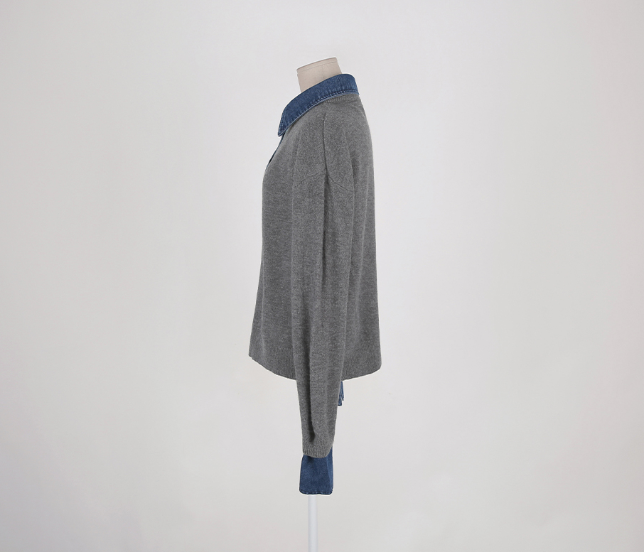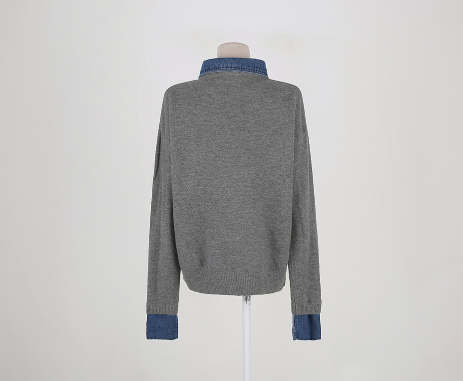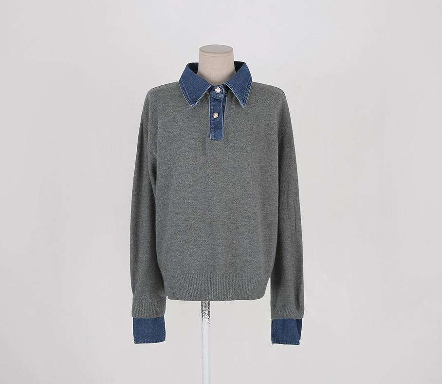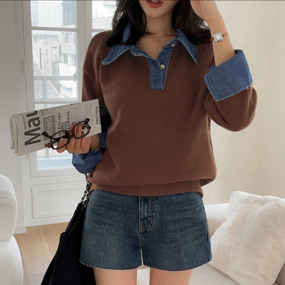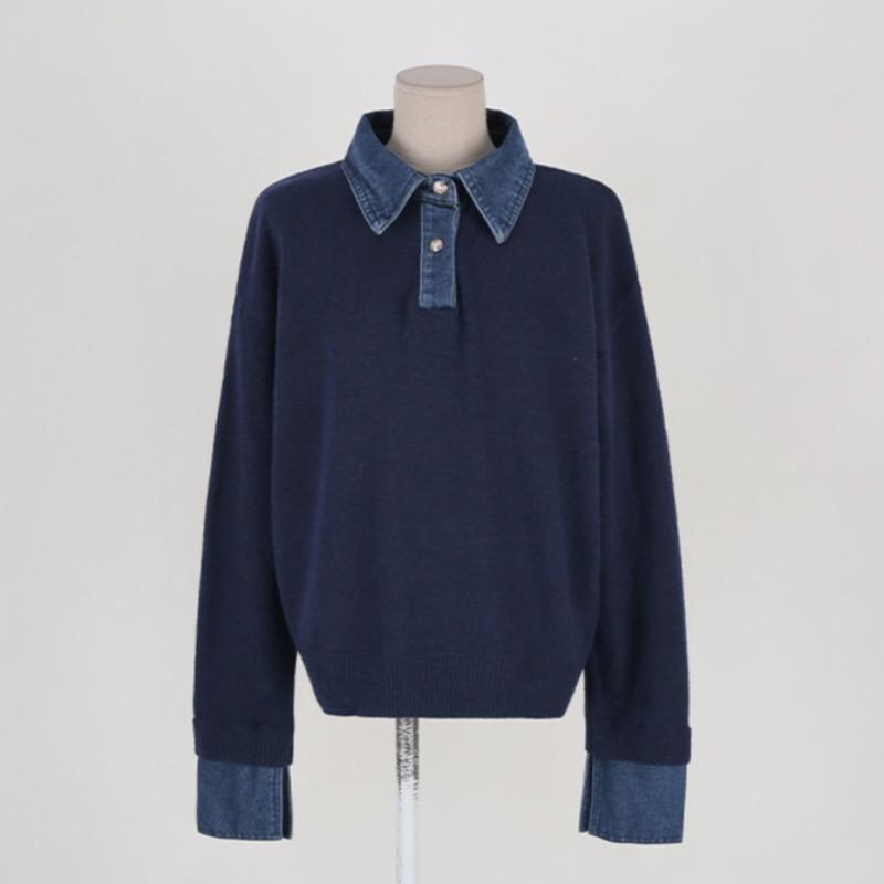 CGD6904-52B 秋冬牛仔POLO翻領拼接假兩件毛衣(3色)