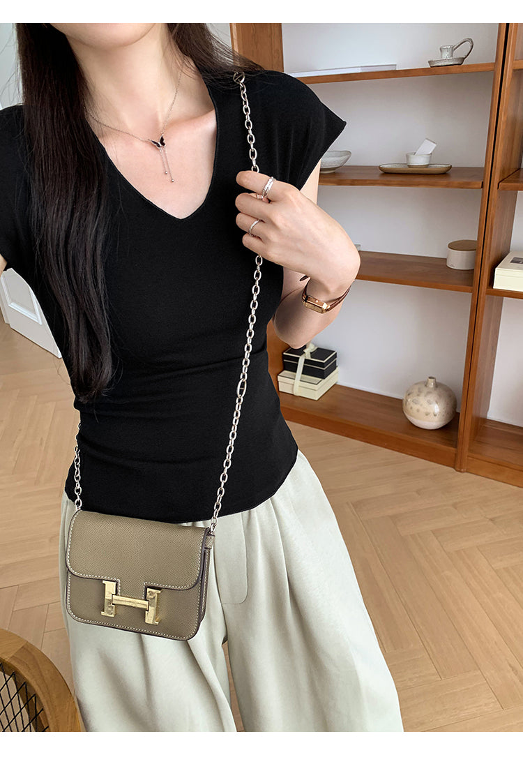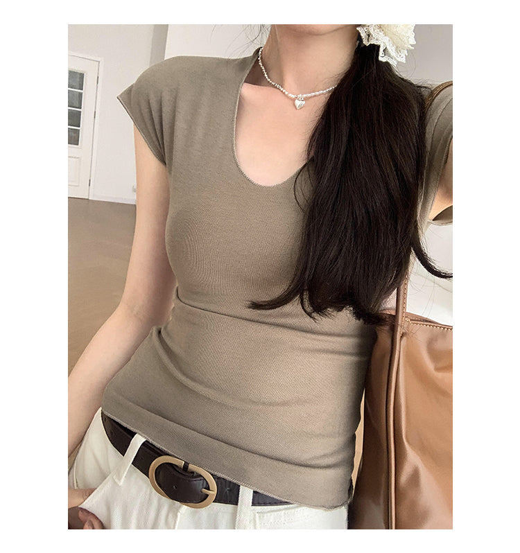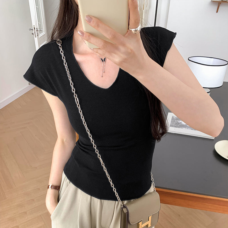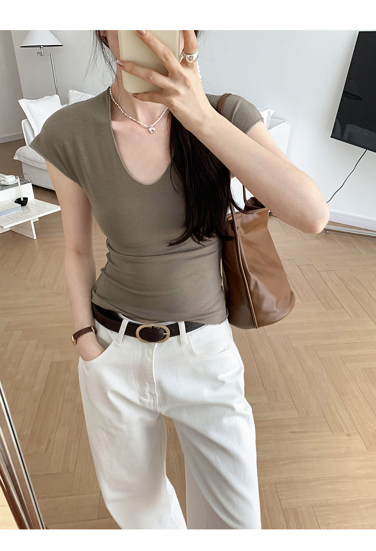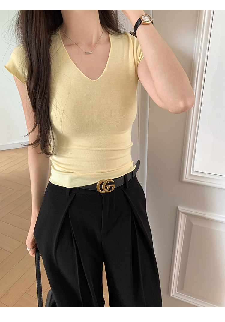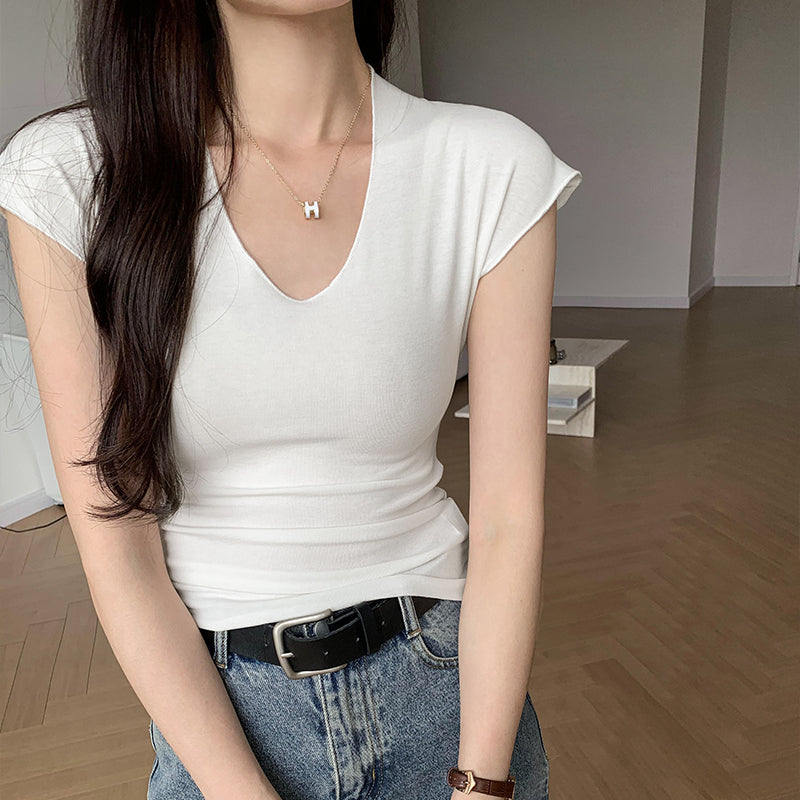 CGE240120-45B 小眾V領落肩短袖T恤(2色)