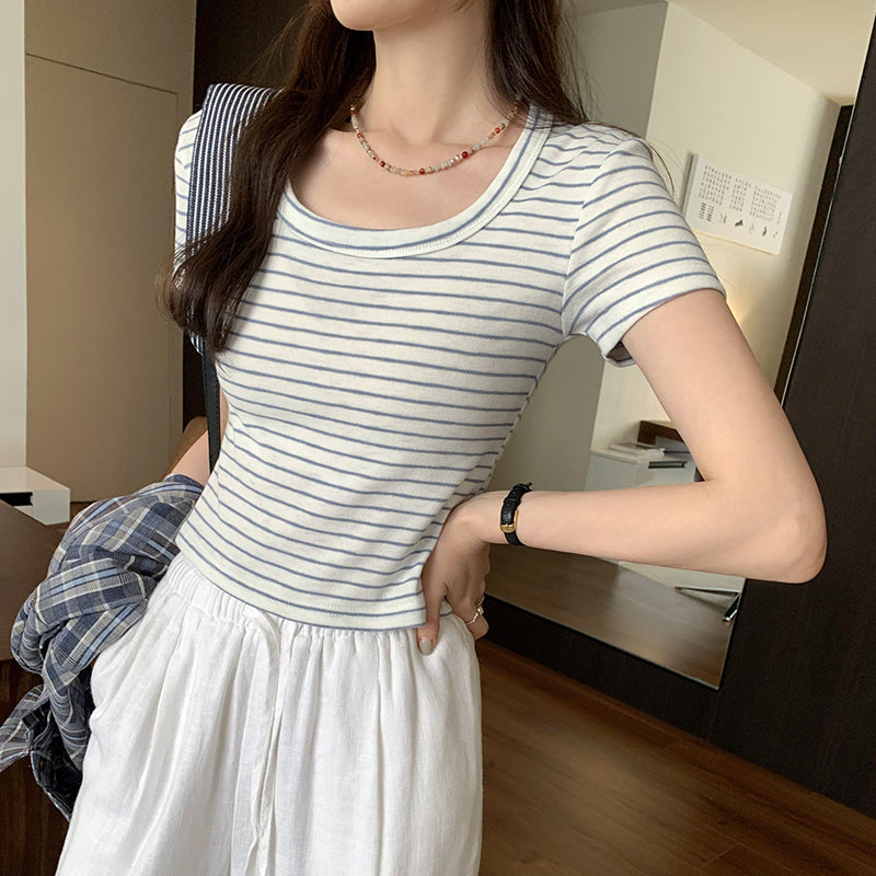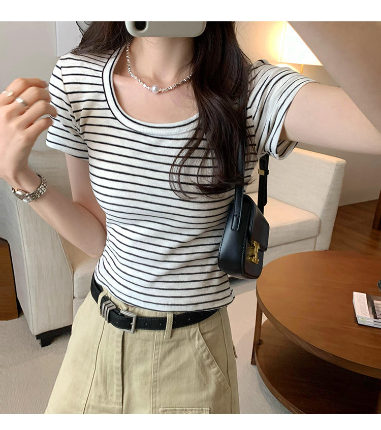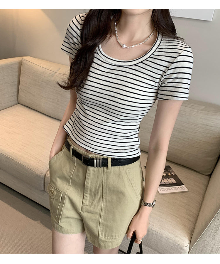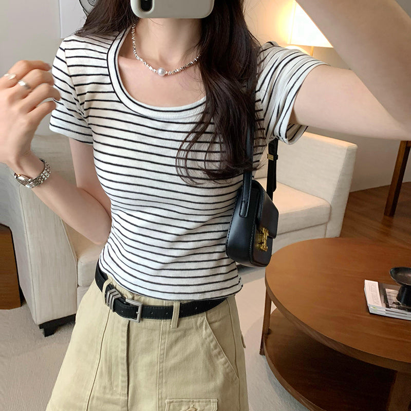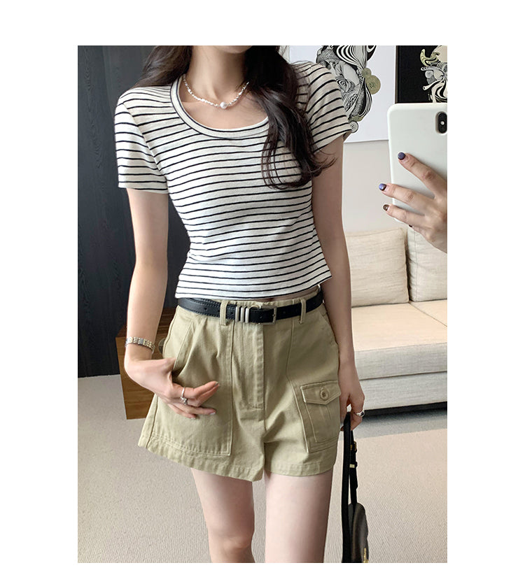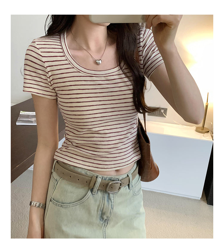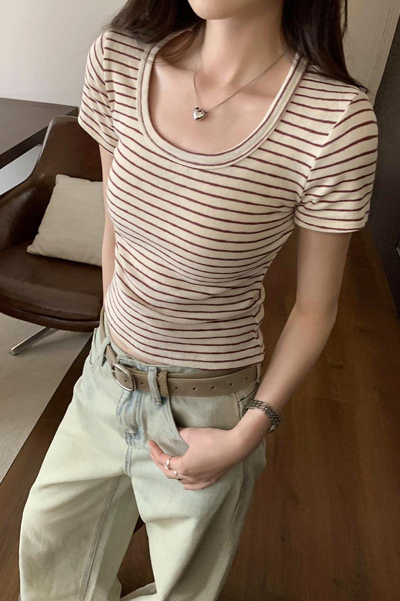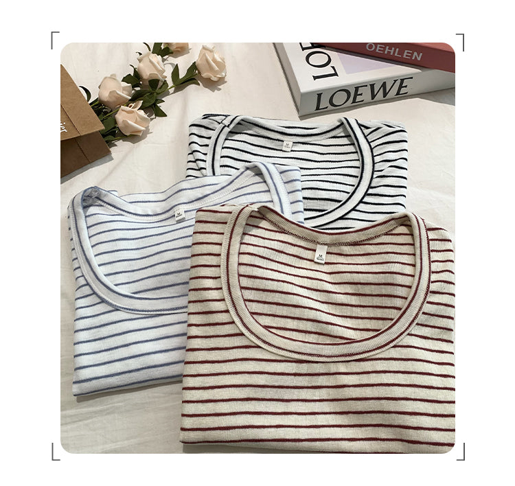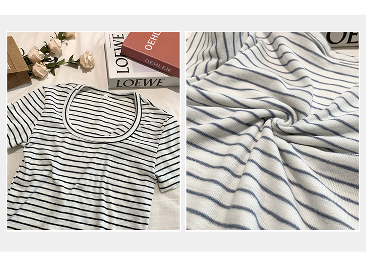 CGE250066-45B 小香風短款正肩條紋短袖T恤(3色)
