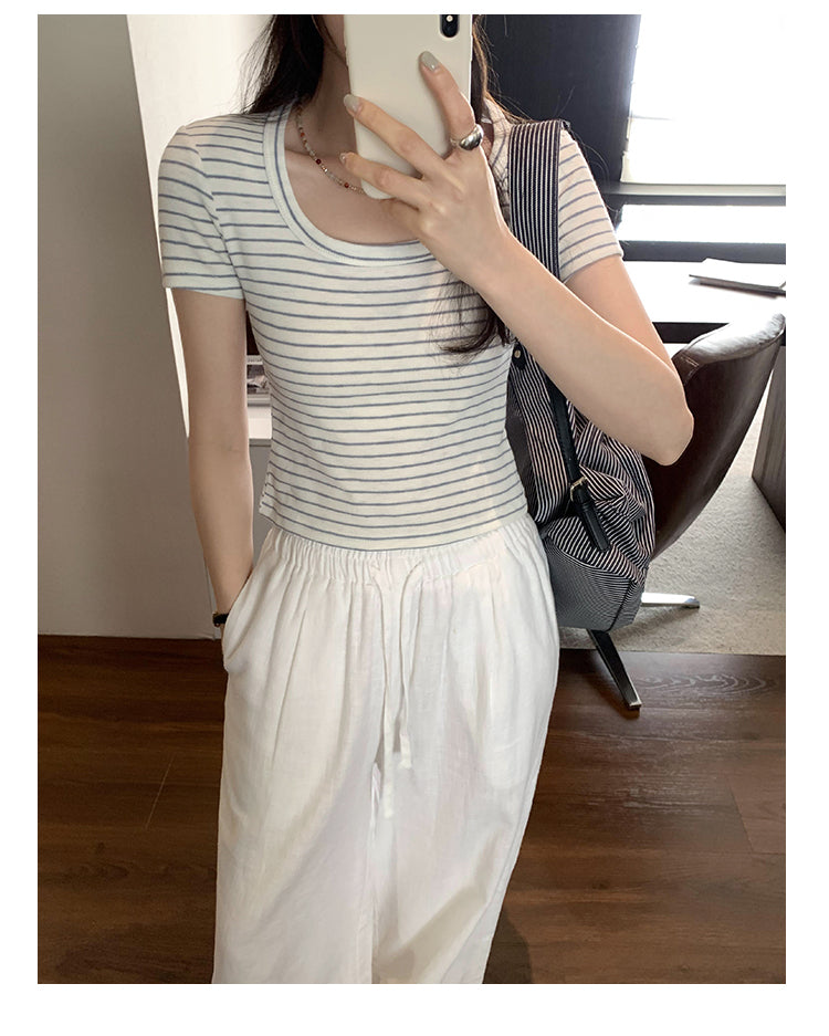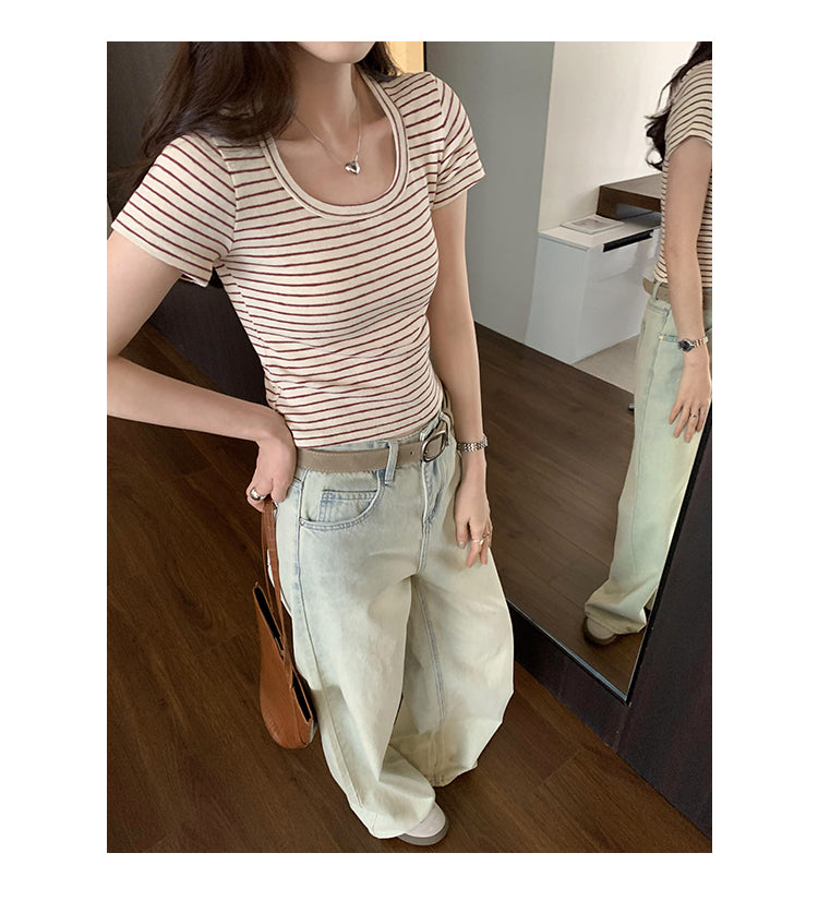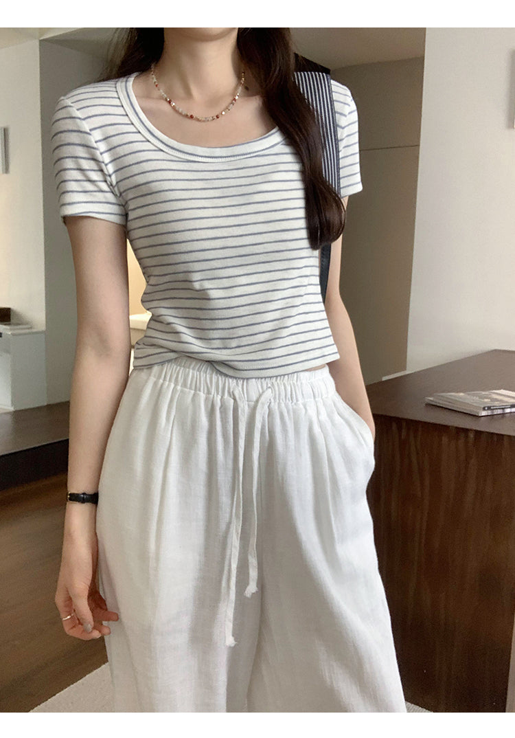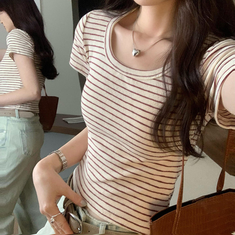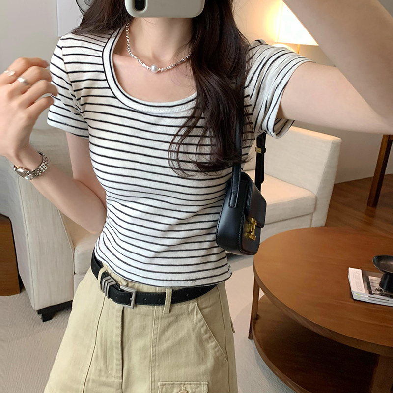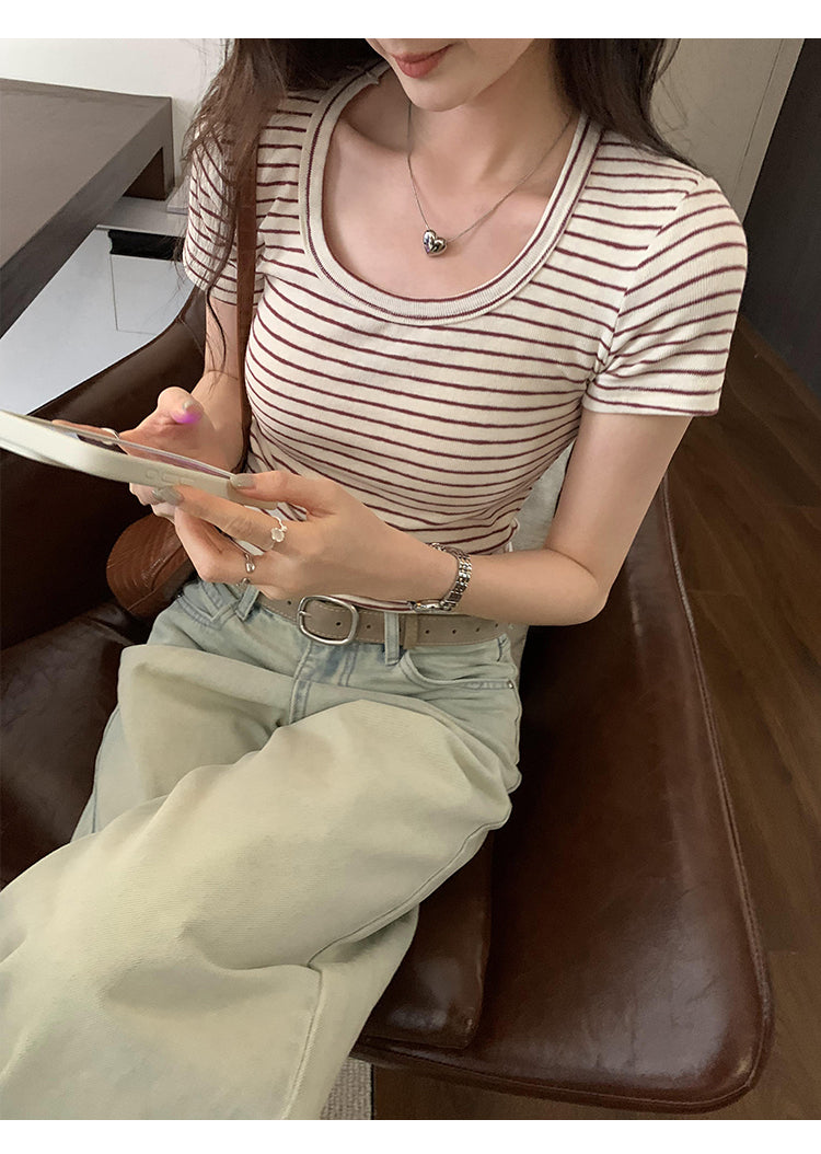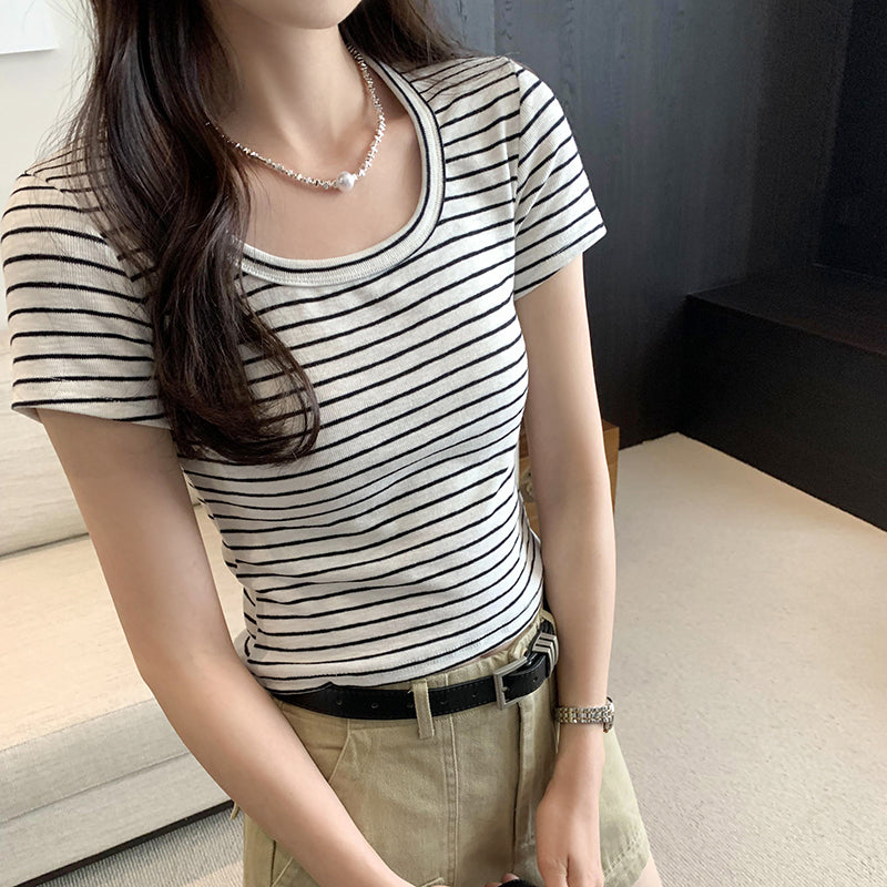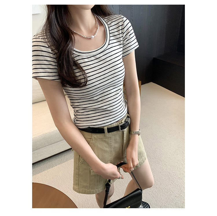 CGE250066-45B 小香風短款正肩條紋短袖T恤(3色)