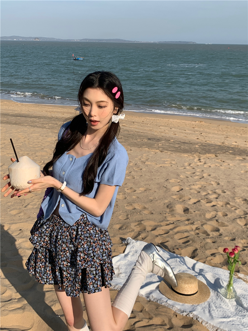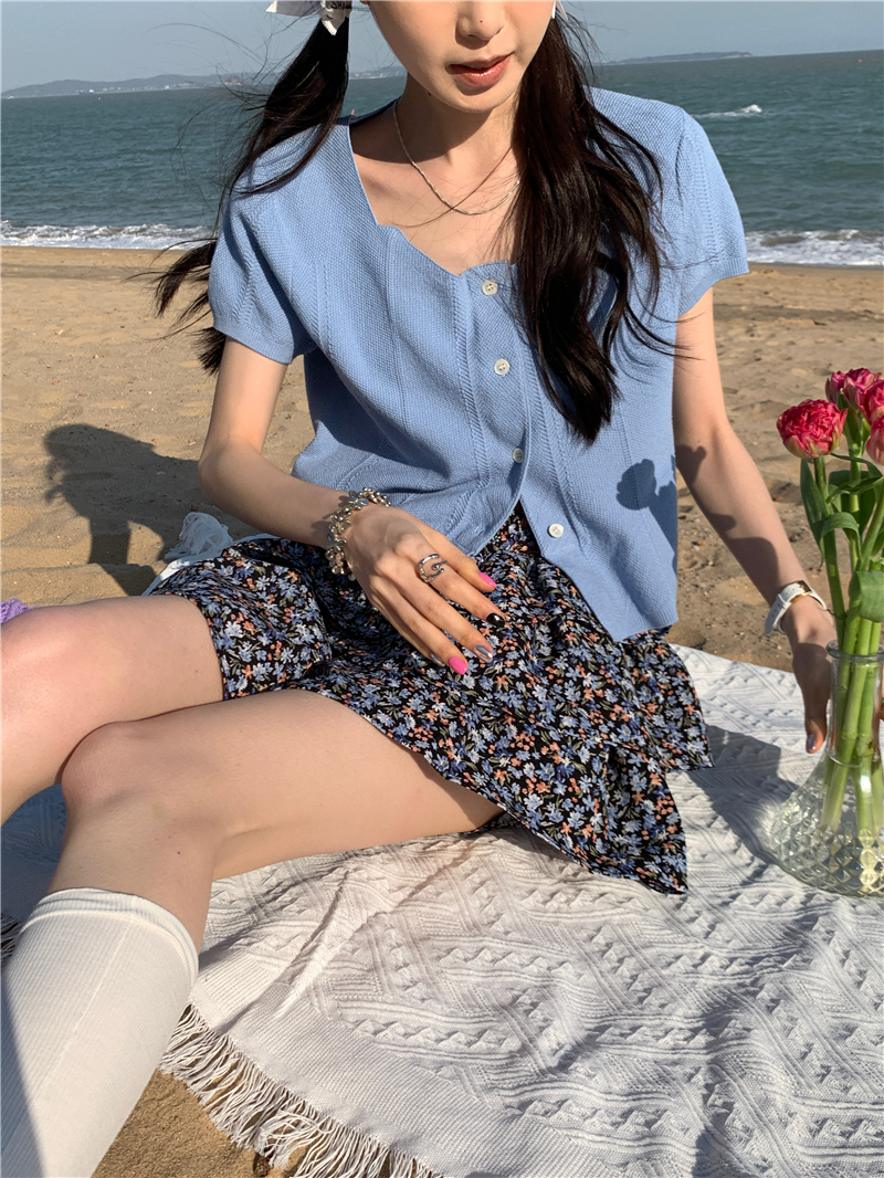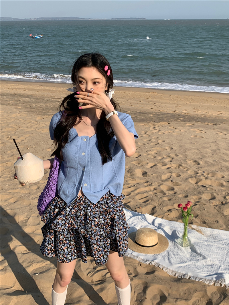 CGE5277-120B 百搭方領針織上衣+碎花小短裙套裝