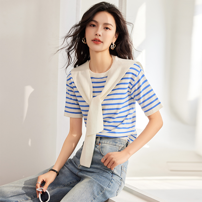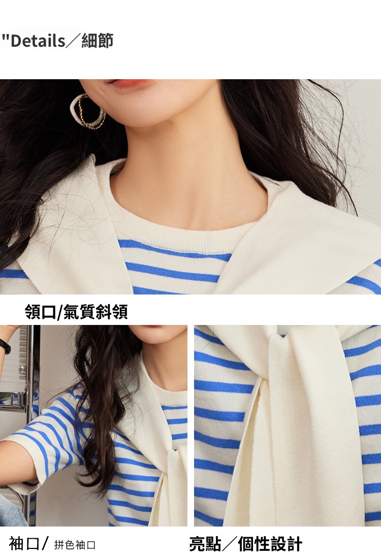 CGE8503-17B 條紋針織夏季海軍風披肩假兩件上衣
