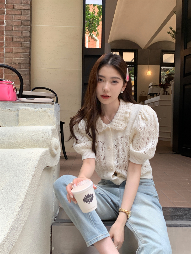 CGE889-120B 氣質百搭白色鏤空泡泡袖針織毛衣