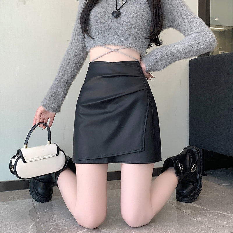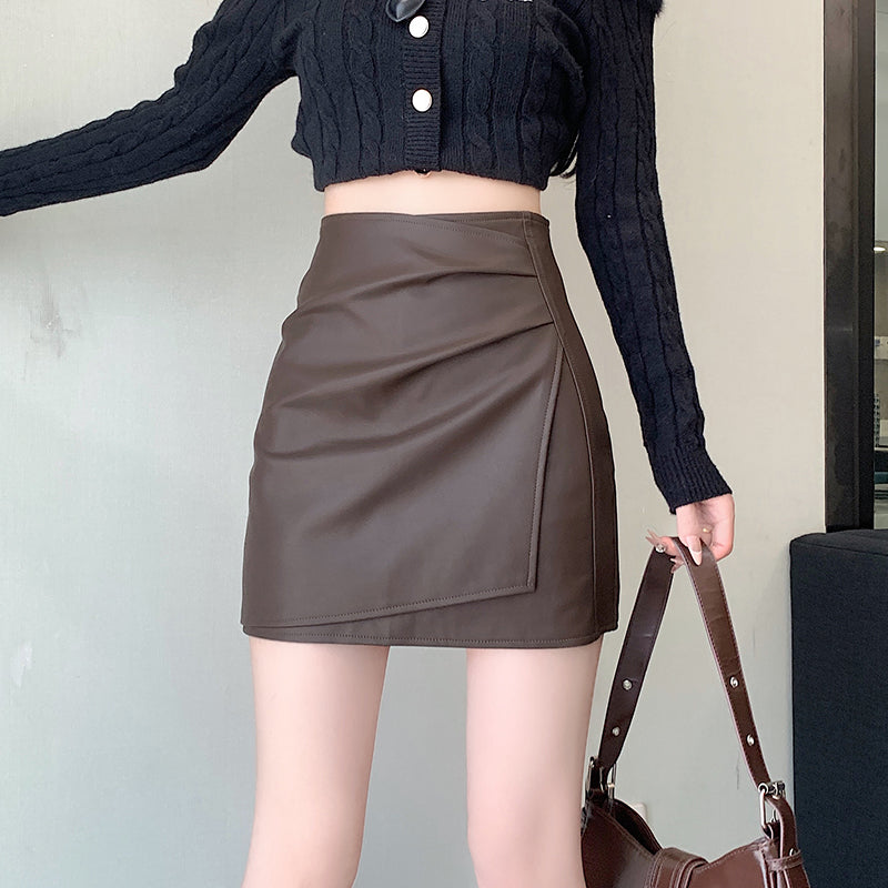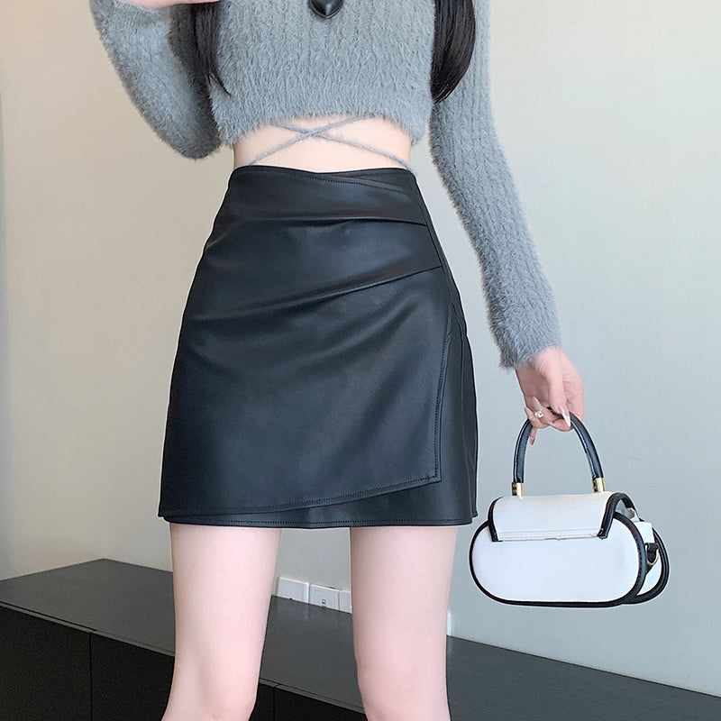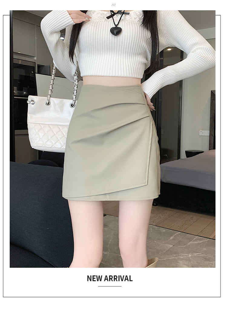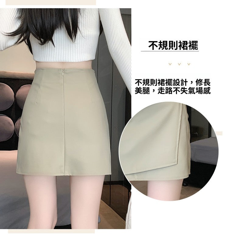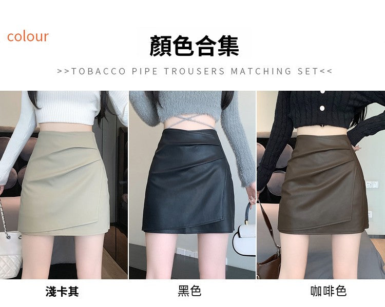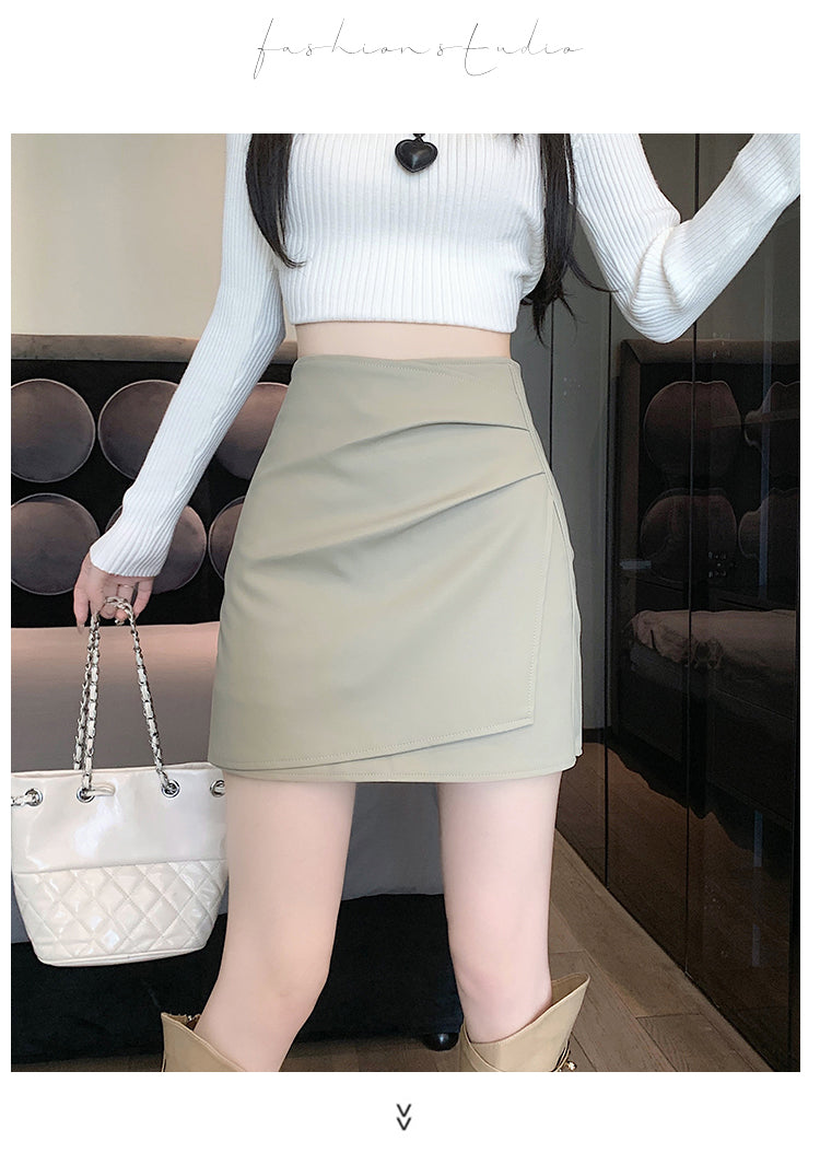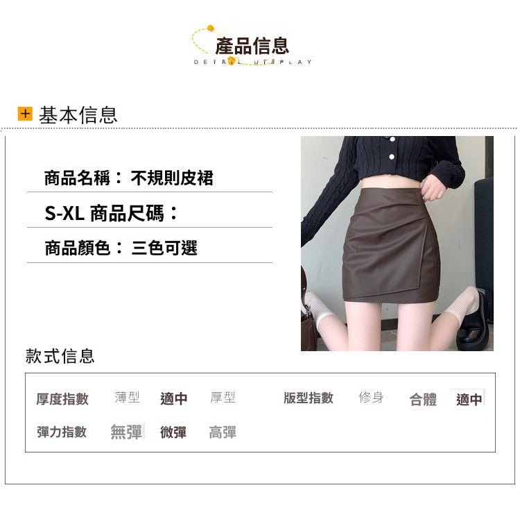 📺︎︎ CGS1134-58B 秋高腰褶皺柔軟皮不規則包臀PU皮A字半身裙短裙(3色)
