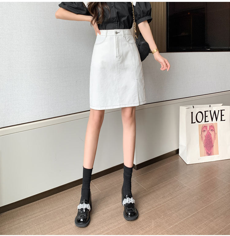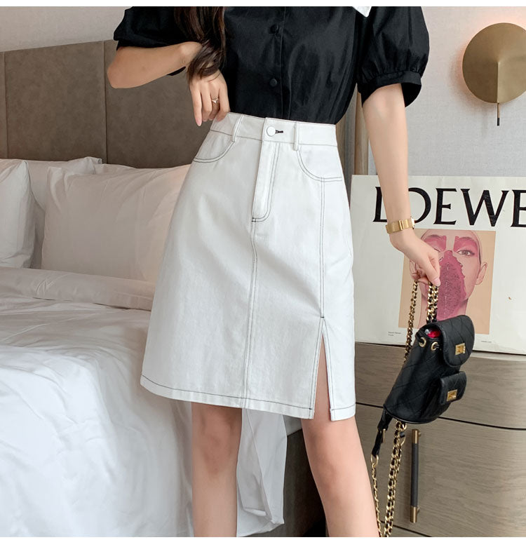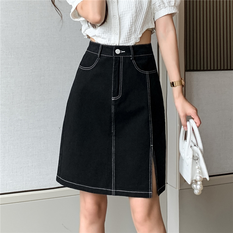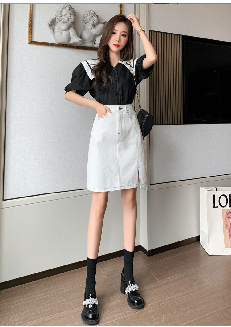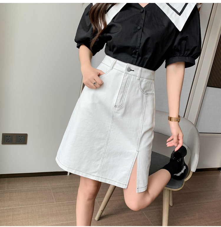 CGS9763-82B 洗水開叉半身裙夏季撞色A字牛仔短裙(2色)